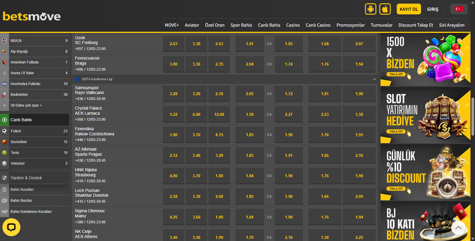 Canlı maç izleme ve bahis yapma denilince akla ilk futbol gelir ama aslında seçenekler çok daha geniş. Betsmove gibi güçlü altyapıya sahip platformlarda basketbol, tenis, voleybol, masa tenisi, e-spor ve hatta sanal sporlar gibi birçok dalda canlı yayın bulabilirsin. Her branşın kendine özgü dinamikleri var ve bunları öğrendikçe bahis stratejin de güçleniyor.